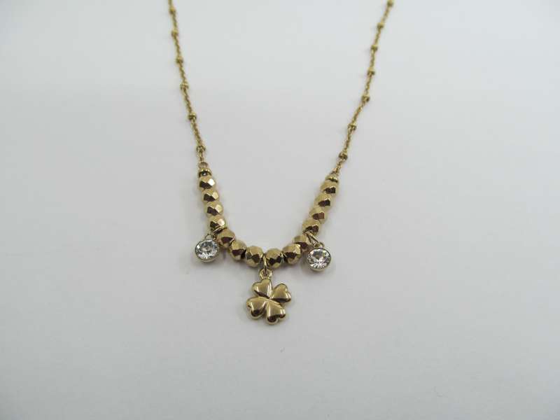 Pozlacený ocelový náhrdelník s kamínky a čtyřlístkem, délka 42+3 cm
