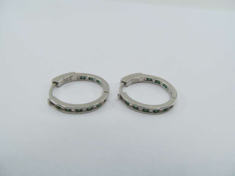 Stříbrné rhodiované náušnice se zelenými zirkony, průměr 20 mm