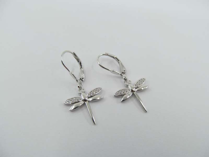 Stříbrné visací náušnice se zirkony, klasické zapínání na klapku, vážka 1,5 x 1,5 cm