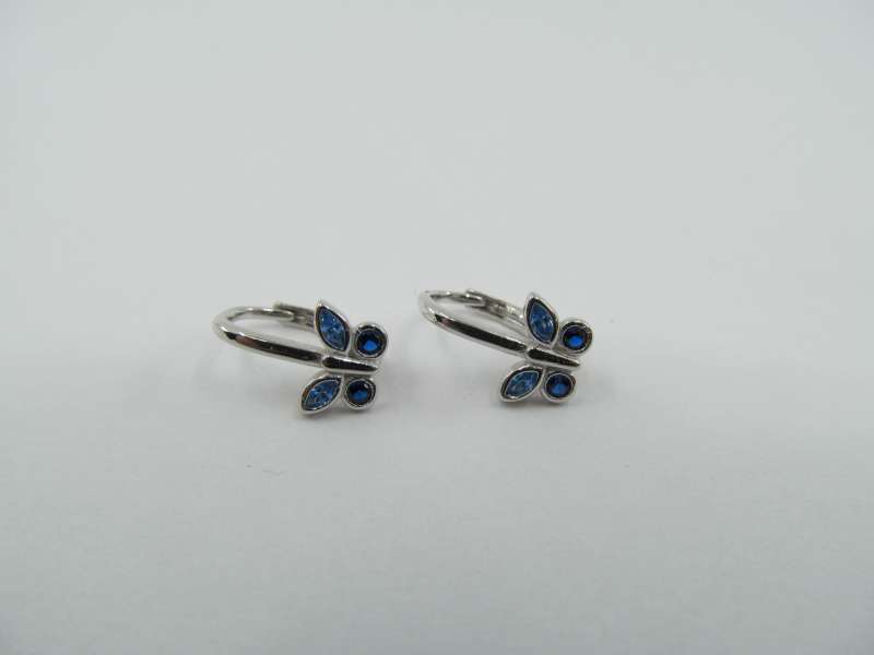 Stříbrné dětské pokračovací náušnice, zadní zapínání, modré zirkony, motýlek