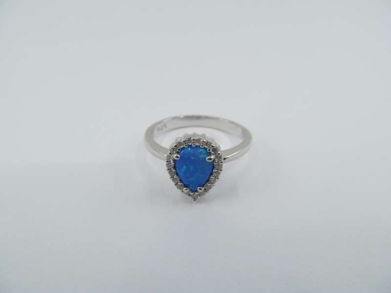 Stříbrný prsten se zirkony a syntetiským modrým opálem, rhodiovaný, vel.57