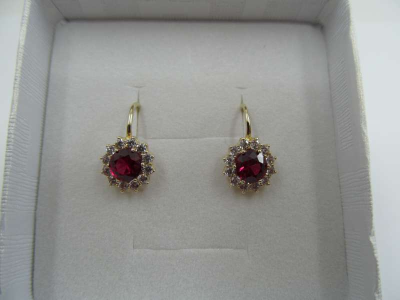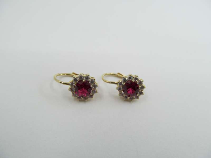 Zlaté klasické náušnice se zirkony, středový červený zirkon, 2,85g, 585/1000, průměr 1 cm