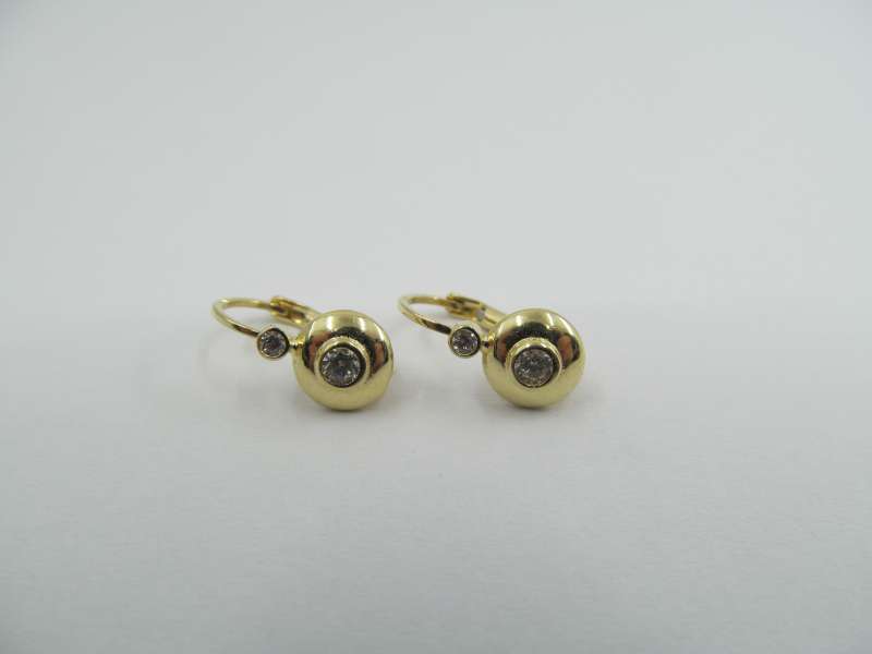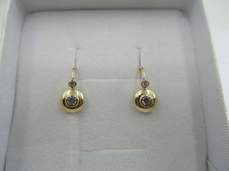 Zlaté dívčí náušnice, zapínání na klapku, 1,54 g, 585/1000, průměr ozdoby 6 mm, délka náušnice 14 mm. zirkony