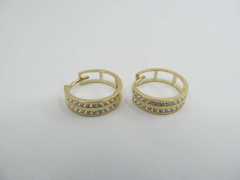 Zlaté náušnice kruhy se zirkony, průměr 1,5 cm, šířka 4 mm, 2,20 g, 585/1000